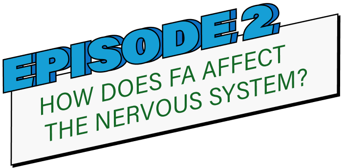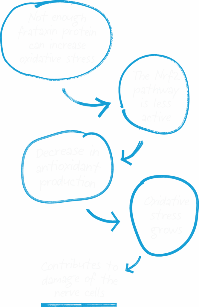For people living with FA, oxidative stress can lead to a communication breakdown between the brain and the nerves. Ever heard of “free radicals”? They are unstable molecules that can cause damage when left unchecked. Free radicals occur with everyday function, but can also be produced by external factors such as diet, stress, smoking, inflammation, and exposure to the sun. In people with FA, the buildup of free radicals – known as oxidative stress – is caused by a deficiency in the protein called frataxin (discussed in episode 1).