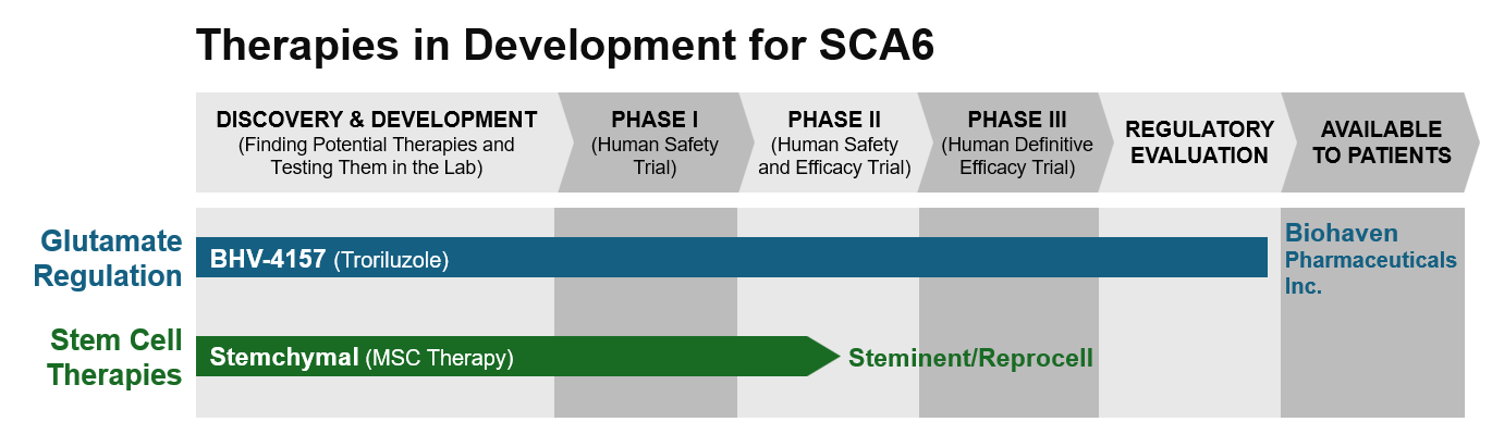 This is a visual tool created to show the progress of SCA6 therapies that are currently being developed. Along the right side of the diagram, treatments are grouped by their mechanism, or how the drug works. The top of the diagram shows the stage of research where the drug is in development. Phases 1 through 3 involve clinical trials with human participants. Visit our PrepRARE: Clinical Trial Readiness Education page to learn more about each phase.