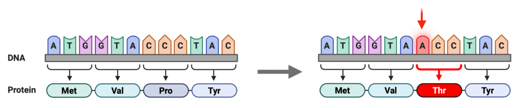 For example, the DNA sequence illustrated below contains the codon CCC, which codes for the amino acid proline (Pro). A missense mutation affecting the first chemical base in this codon may result in a new codon—ACC—which codes for the amino acid threonine (Thr). This seemingly minor change in DNA sequence can have significant consequences, especially if the originally intended amino acid proline plays a crucial role in the structure and function of the protein coded by the larger gene sequence.